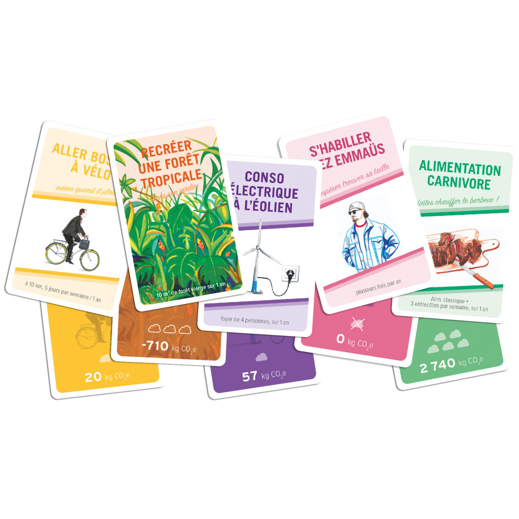 Chaque carte représente une action : acheter un smartphone, laisser la lumière allumée, manger un gros burger, ou encore partir en vacances en covoiturage. Chacune d’entre elles est associée à la quantité de CO2 qu’elle émet, et permet donc de comparer, de manière ludique, tout ce qui compose notre quotidien.