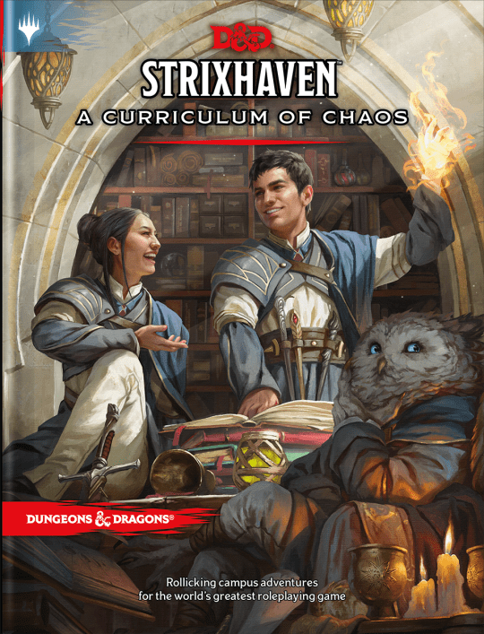 Strixhaven: A Curriculum of Chaos introduces the fantastical setting of Strixhaven University, drawn from the multiverse of Magic: The Gathering, and provides rules for creating characters who are students in one of its five colleges. Characters can explore the setting over the course of four adventures, which can be played together or on their own. Each adventure describes an academic year filled with scholarly pursuits, campus shenanigans, exciting friendships, hidden dangers, and perhaps even romance.