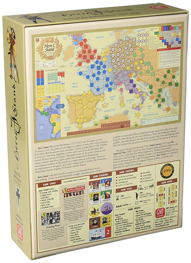 Here I Stand: Wars of the Reformation 1517-1555 is the first game in over 25 years to cover the political and religious conflicts of early 16th Century Europe. Few realize that the greatest feats of Martin Luther, Jean Calvin, Ignatius Loyola, Henry VIII, Charles V, Francis I, Suleiman the Magnificent, Ferdinand Magellan, Hernando Cortes, and Nicolaus Copernicus all fall within this narrow 40-year period of history. This game covers all the action of the period using a unique card-driven game system that models both the political and religious conflicts of the period on a single point-to-point map.