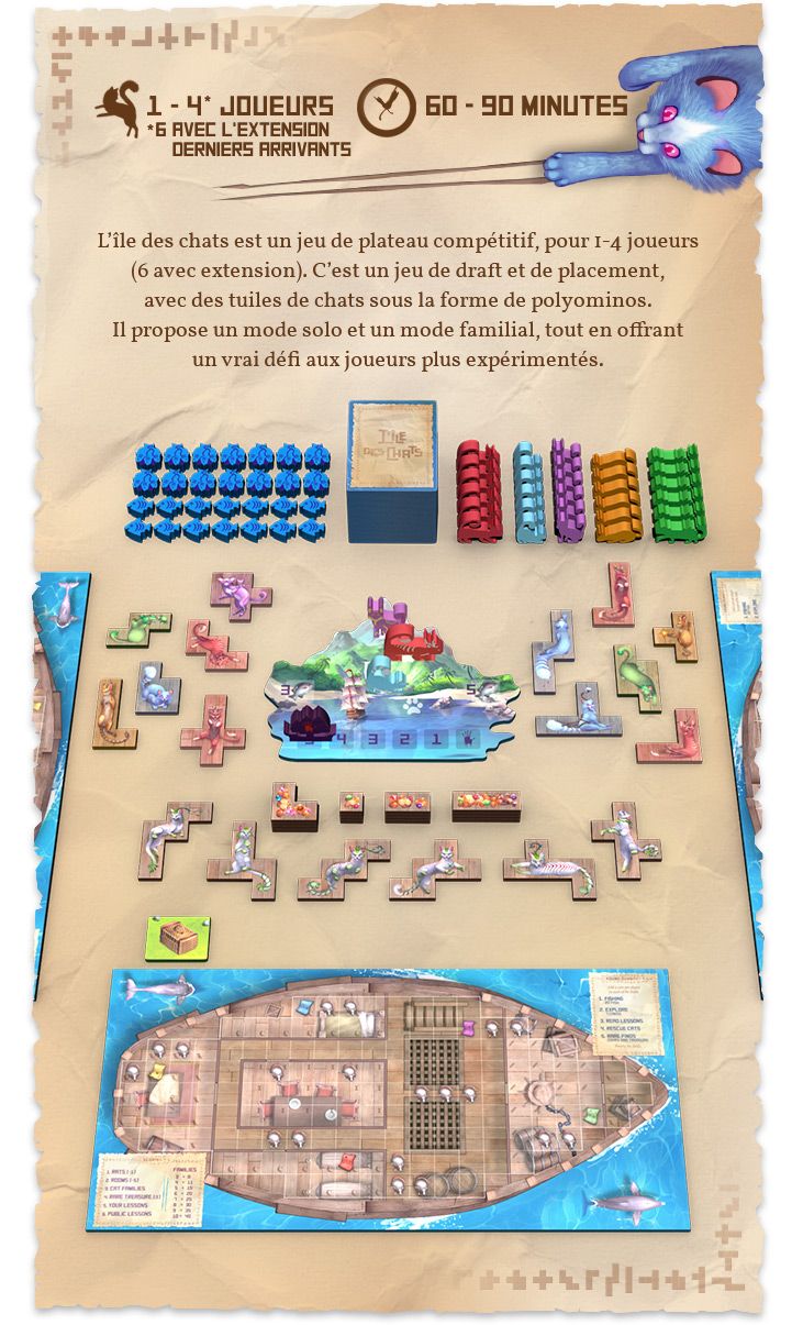 Vous devez explorer l’île, secourir les chats, récupérer des trésors anciens et trouver un moyen de tout entreposer dans votre bateau avant de revenir vers la sécurité de l’Impasse des Miaulements. Alors que vous explorerez l’île, vous sauverez des chats et découvrirez des trésors. Les chats et les trésors sont représentés par des tuiles de différentes formes que vous devrez positionner avec soin sur votre bateau.