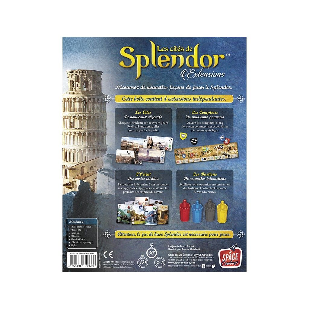 Les Cités de Splendor contient 4 extensions indépendantes pour Splendor, le premier jeu des Space Cowboys :