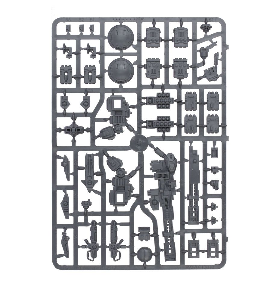 Ce kit en plastique multi-parties contient 91 composants et une feuille de transfert T’au pour créer une combinaison de combat Broadside et deux drones.